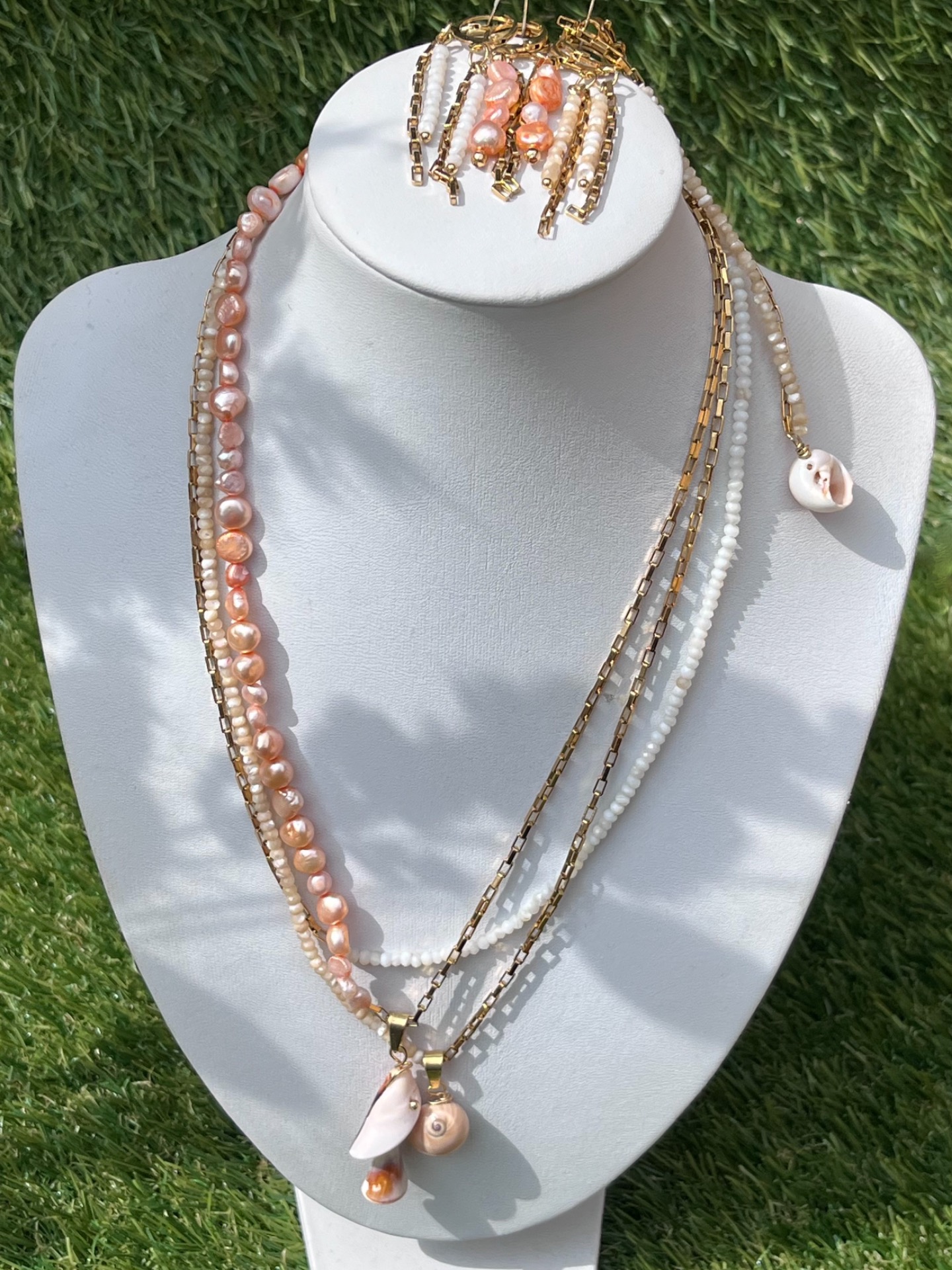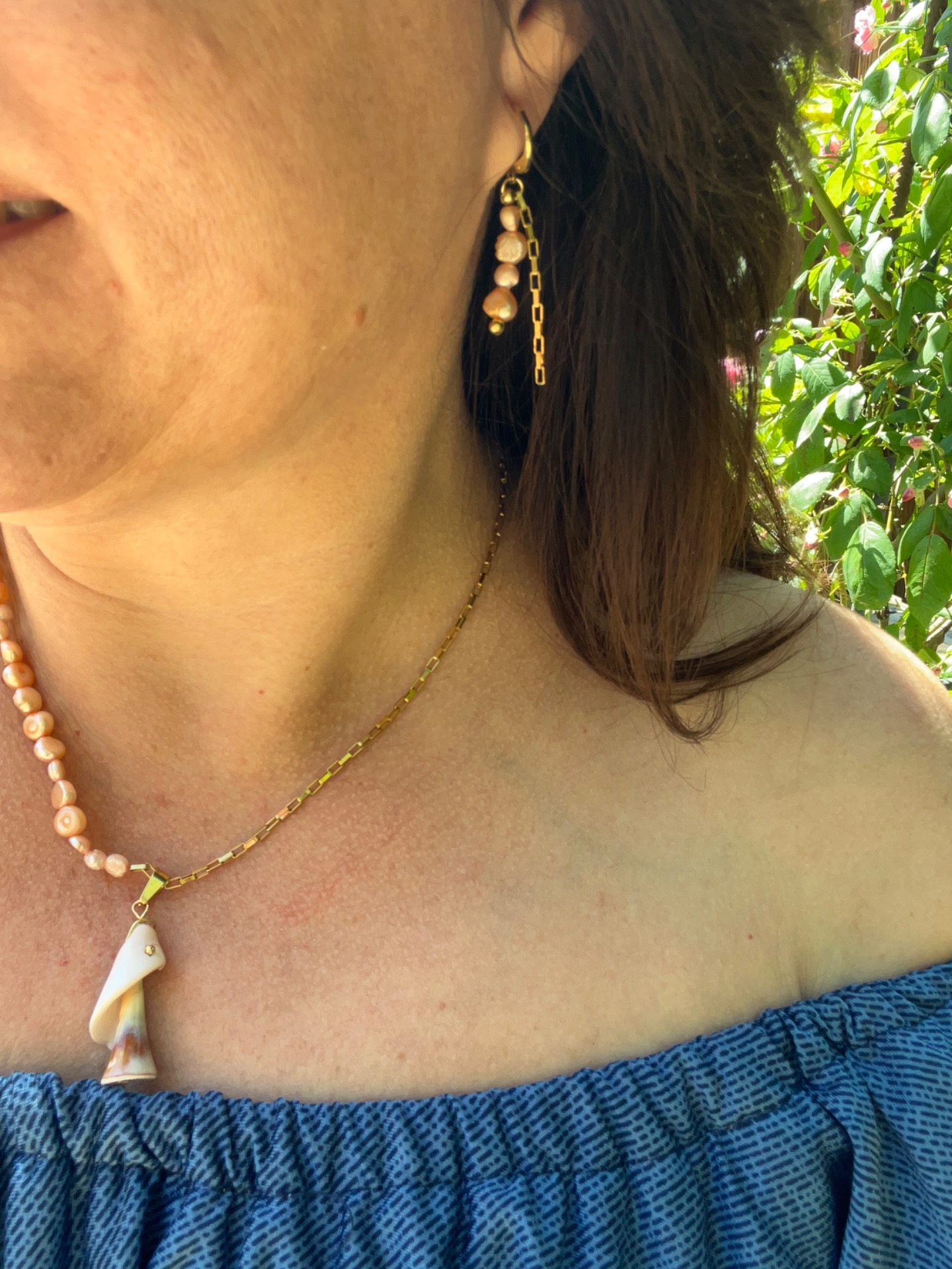 Anyaga: nemesacél és festett kagylógyöngyök, csiszolt csigaház